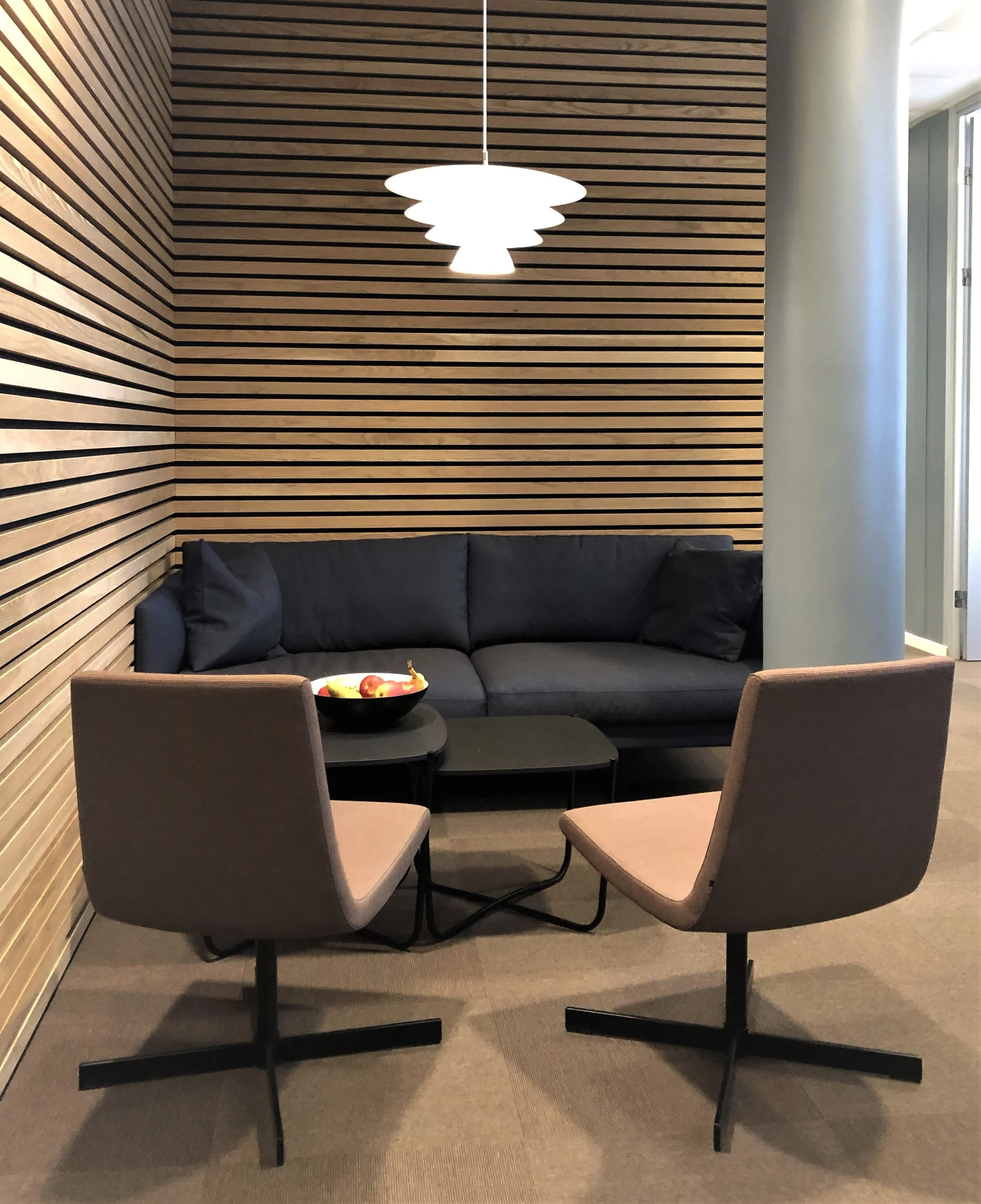 Vi fikk i oppdrag å foreslå nye farger og møbler til Finnmark kraft, og de ønsket seg noe annet enn et typisk kontorpreg i de ulike rommene. Vi har gått for en rolig og varm fargepalett i blåtoner, og med trespiler og teppeflis på gulv ble det et flott og moderne lokale.